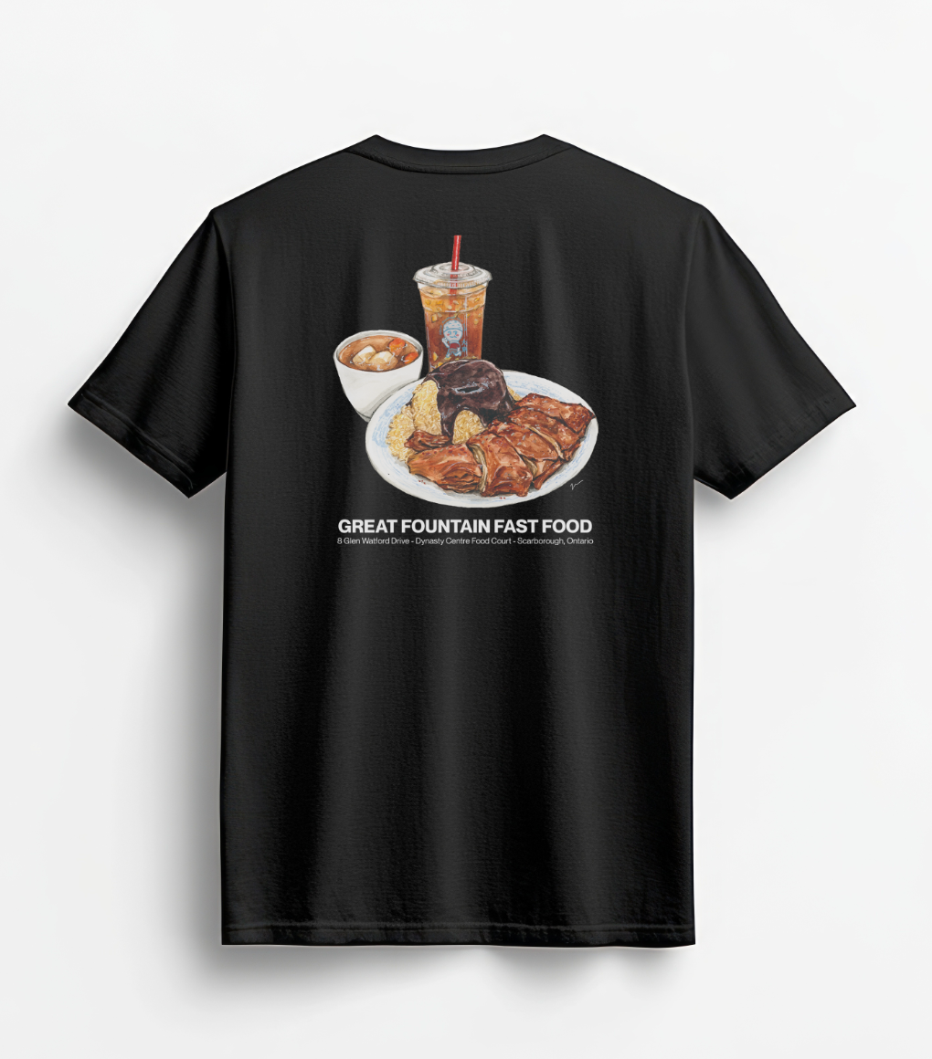 - Hand Illustrated Shirt 🎨 - Garlic Fried Chicken on Fried Rice (Item Number T39), Black Cotton Unisex Tee by Tanya of Tonton Art